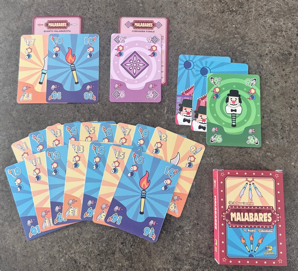 Malabares is a 18-card micro trick-taking game inspired by juggling. Players start with cards in hand, and some cards begin on the table representing what it's "in the air". A trick goes by playing cards in a must-follow fashion, and the numbers determine the order of drafting for the "in the air" cards.
