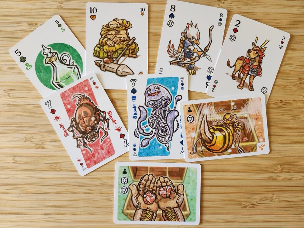 The cards consist of ranks 1 through 11 in four suits. The base game uses 3 types of poisons, and 4 optional cards add a fifth. Some cards have jewels, and some have medicine. Other cards have no special feature.