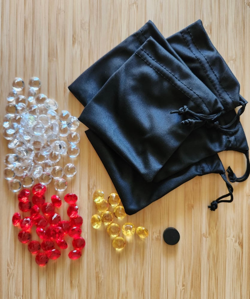 After each trick, the winner of the trick collects, in front of themselves, any jewels shown on the cards played and any poison or medicine cards played. Next, before the following trick proceeds, a card is revealed from a different deck of cards. Some of these cards have poisons on them, and others only jewels.
