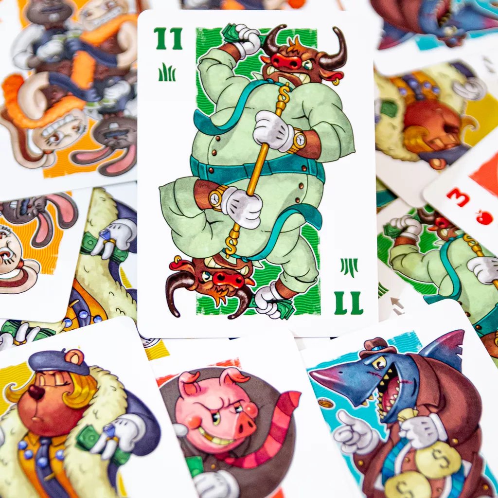 It's 10 am and the Animalia Stock Exchange opens its doors, attracting many investors who are in search of the best business opportunities. Jacques and Marie, a couple of rabbits, want to secure a quick profit on Carotte Orange SCA shares. Felipe, the shark, tries to convince Karl, the pig, that Peixe Azul S.A. It's a good deal, but the pig is only interested in Roter Apfel AG, whose shares have already earned him good profits recently. Hank the bull is confident of Green Grass Inc's rising profits, but Sofia the bear prefers to be more cautious and make a safe investment in Miele Giallo S.p.A. Finally, Harshad, the wolf, tries to convince everyone that he is a successful investor, but there are rumors that he became a millionaire with a pyramid scheme. Before the Exchange closes its operations, anything can happen! Who will raise both arms and shout “STONKS!” in celebration?