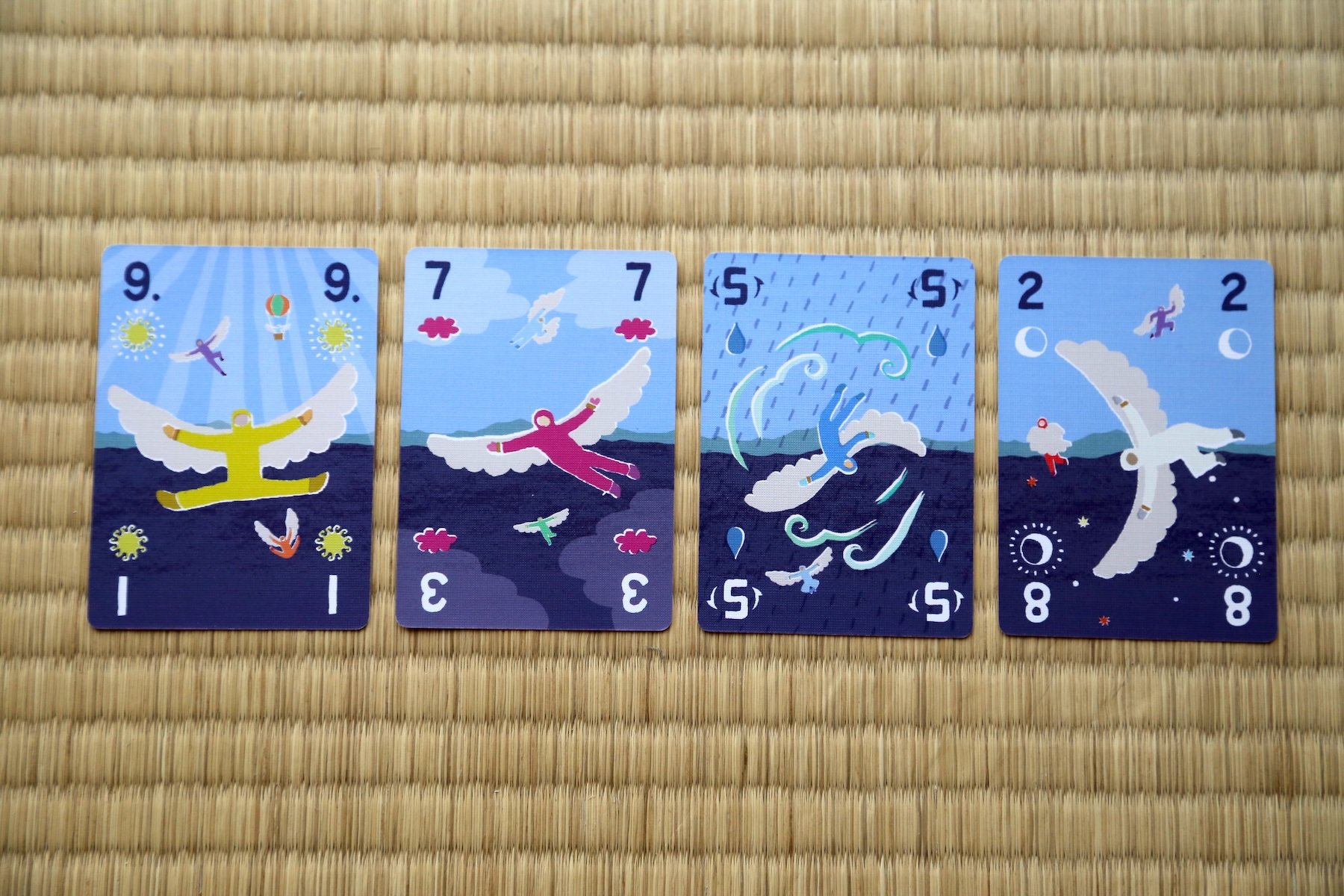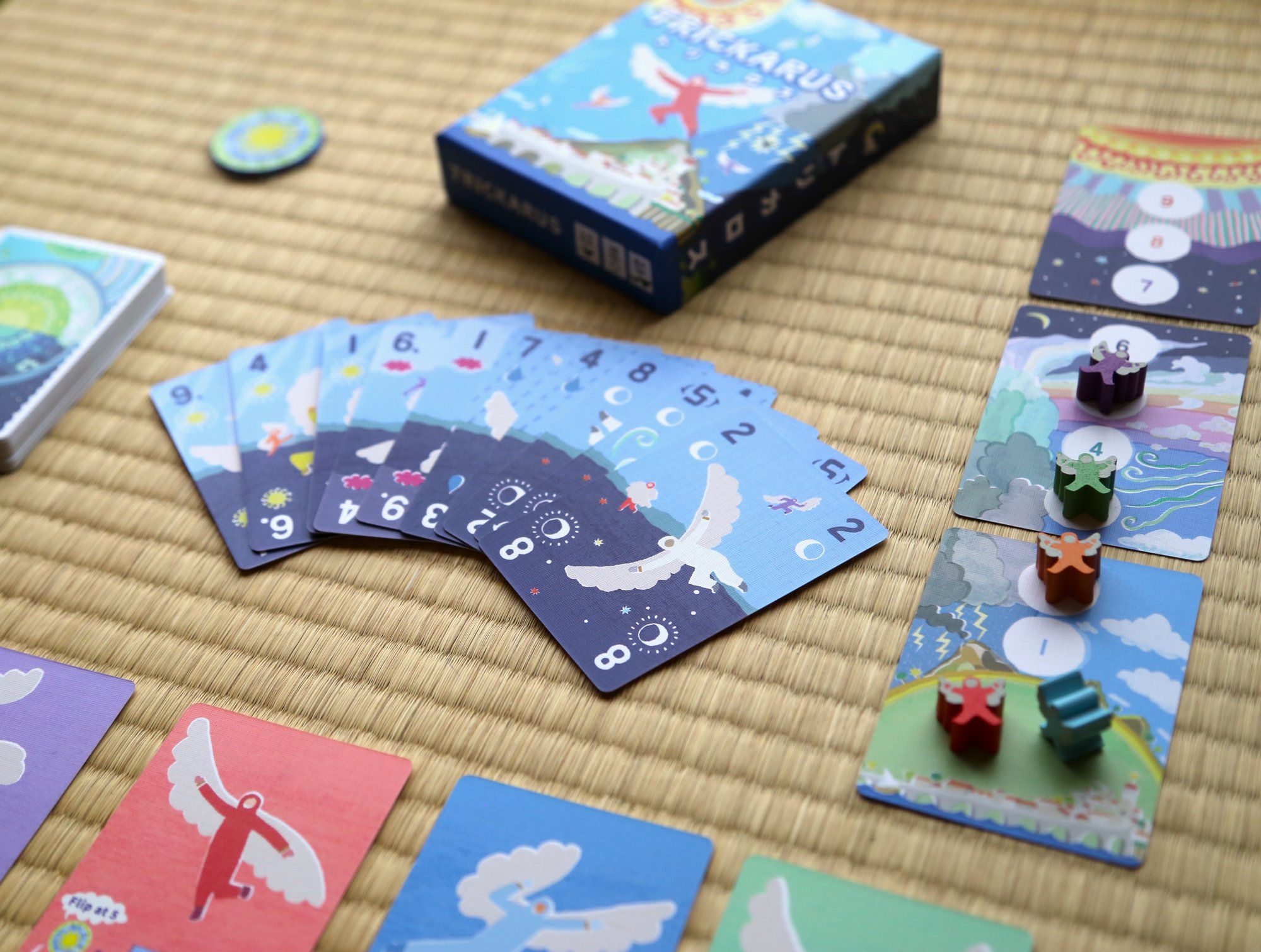 Icarus and his friends have crafted handmade wings. Day and night, jubilant with their newfound freedom, they fly higher and higher. Trickarus is a trick-taking game of flying, flipping, and trying not to soar into the hot, hot sun. The game can be played in either competitive or cooperative modes.