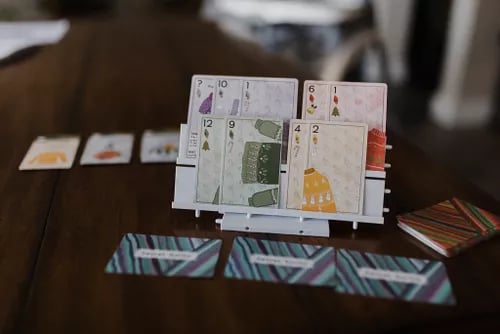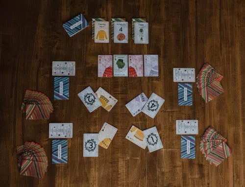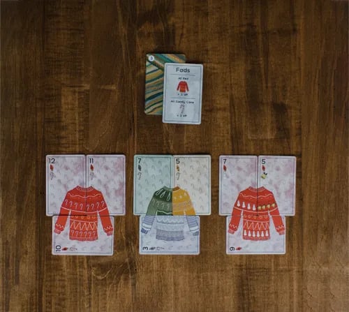 Various gameplay cards (which are drawn at the start of each round) determine gameplay and bonus scoring. The end of a round is triggered when a player completes three sweater builds. At the end of each round, victory points are awarded based on sweaters built and bonus scoring (points for sweaters following round-specific goals and hidden objectives). Build your sweaters quickly!