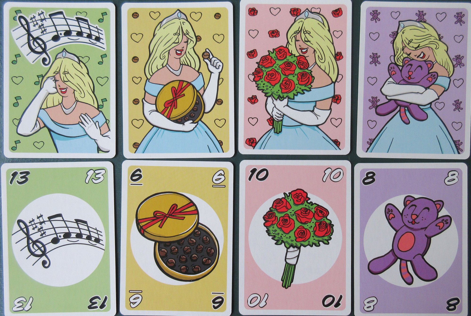 Players are dealt six cards from the Gift deck, with a card from the Princess deck placed face up to determine trump. Over five rounds players take turns placing a card on the table, with highest of the lead suit or trump suit winning, and the person who wins the most cards gets the princess card. The sixth card of the hand is used for an optional tie-breaking round. Once seven princess cards have been won the person who has the most wins the game.